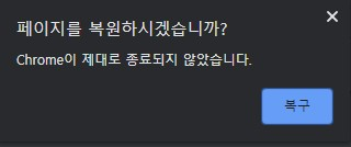일단, 크롬브라우저의 경우에는 비정상 종료가 되었을때는 마지막으로 열었던 탭들을 그대로 복구를 해주는 기능이 있습니다. 물론 실수로 닫았을 경우에는 정상적인 종료이기 때문에 이런 메세지가 보이지 않습니다.