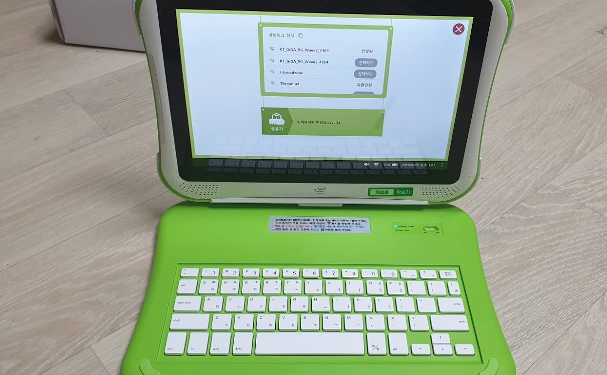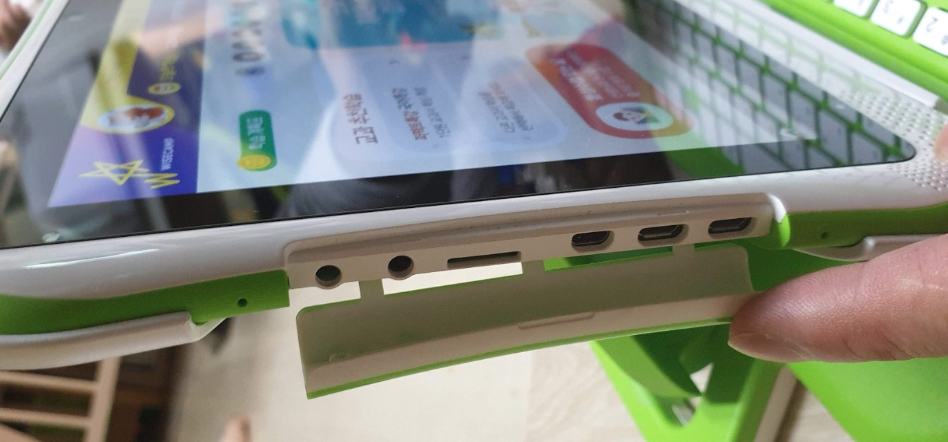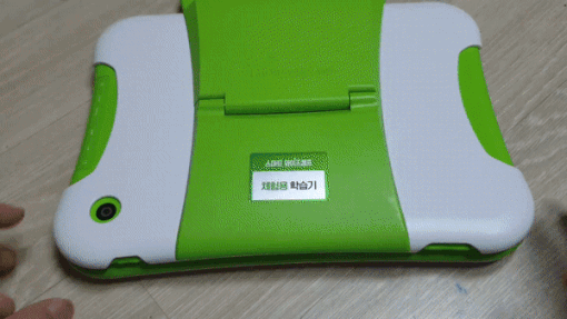 아이들은 크게 상관 없어 하는거 같기는 하지만, 개인적으로 지금까지 받아본 학습기 패드중에서 제일 괜찮은 디자인 이였던거 같습니다. 테블릿+키보드를 합쳐서 노트북같은 형태로 만들어져 있는데요. 아이가 어디서나 쉽게 열어서 원하는 각도로 이용을 할수 있을거 같더라구요. 케이스형태로 되어 있는 거치대보다는 훨신 좋아 보이네요.