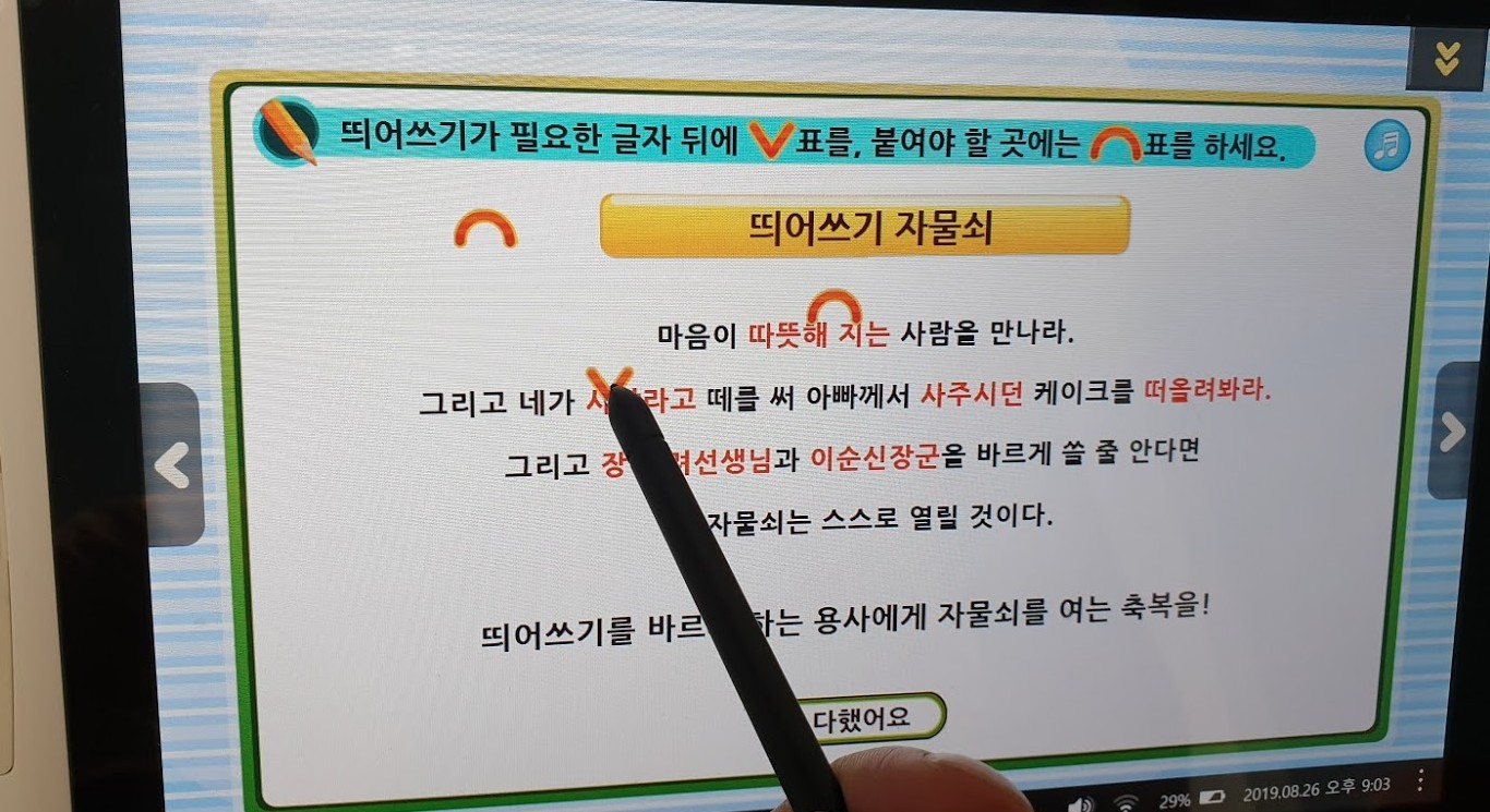 그리고 어제 저녁에 잠깐 오늘의 학습도 했었는데요. 국어 같은 경우에는 아래 화면에서 보는것처럼 띄어쓰기 체크를 하면서 학습을 진행을 했었습니다. 오늘의 학습은 이런식으로 문제를 풀면서 진행 하도록 되어 있더라구요. 앞에는 아이들이 좋아하는 컨텐츠를 보여주고 뒤에서는 관련해서 문제를 풀어 볼수 있도록 하는거 같습니다. 문제 형태도 꾀 다양한 형태로 제공이 되는거 같아요.