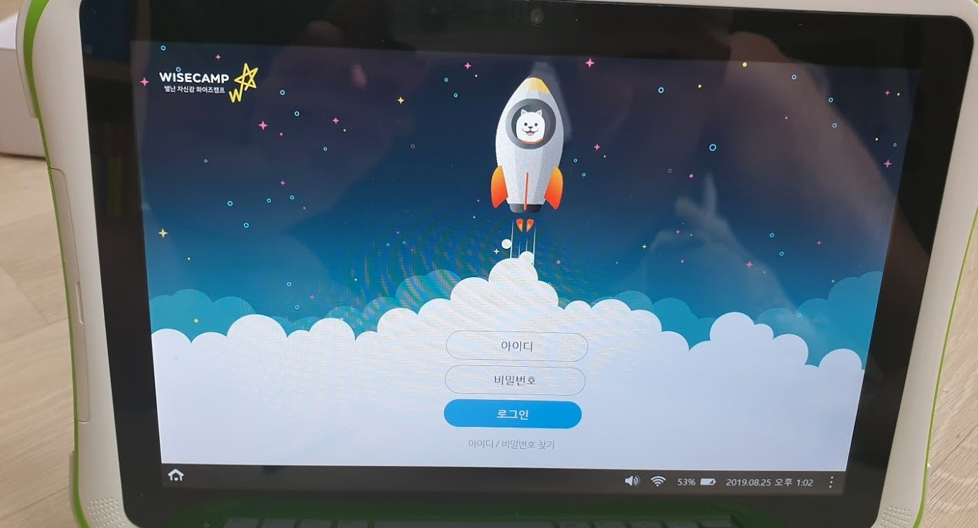 와이파이에 연결을 하고 나면 와이즈 캠프에 로그인을 하셔야 합니다. 저희는 체험용 계정으로 로그인을 했는데 아이에게 맞게 이름과 학년이 모두 설정이 되어 있더라구요. 그래서 바로 학습이 가능 했습니다. ^^