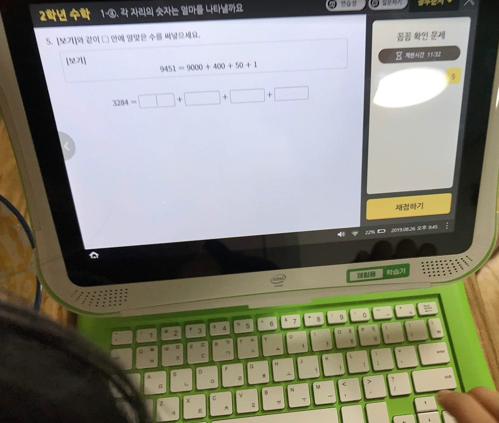 그리고 수학 문제를 풀때는 키보드를 이용하도록 나와 있는데요. 아이들이 그냥 단순히 드레그앤 드롭 하는거나 선택 하는것만 하다가 키보드로 직접 입력을 하는 컨텐츠가 나오니 재미 있어 하더라구요. 아이들이 노트북이 스마트폰키보드로 글을 입력 하는거 좋아 하지 않나요? 저희 아이는 유는히 이런걸 좋아 하는데 그래서 그런지 완전 맞춤 컨텐츠 인거 같네요. 채점도 본인이 직접 눌러서 확인을 하도록 되어 있습니다.