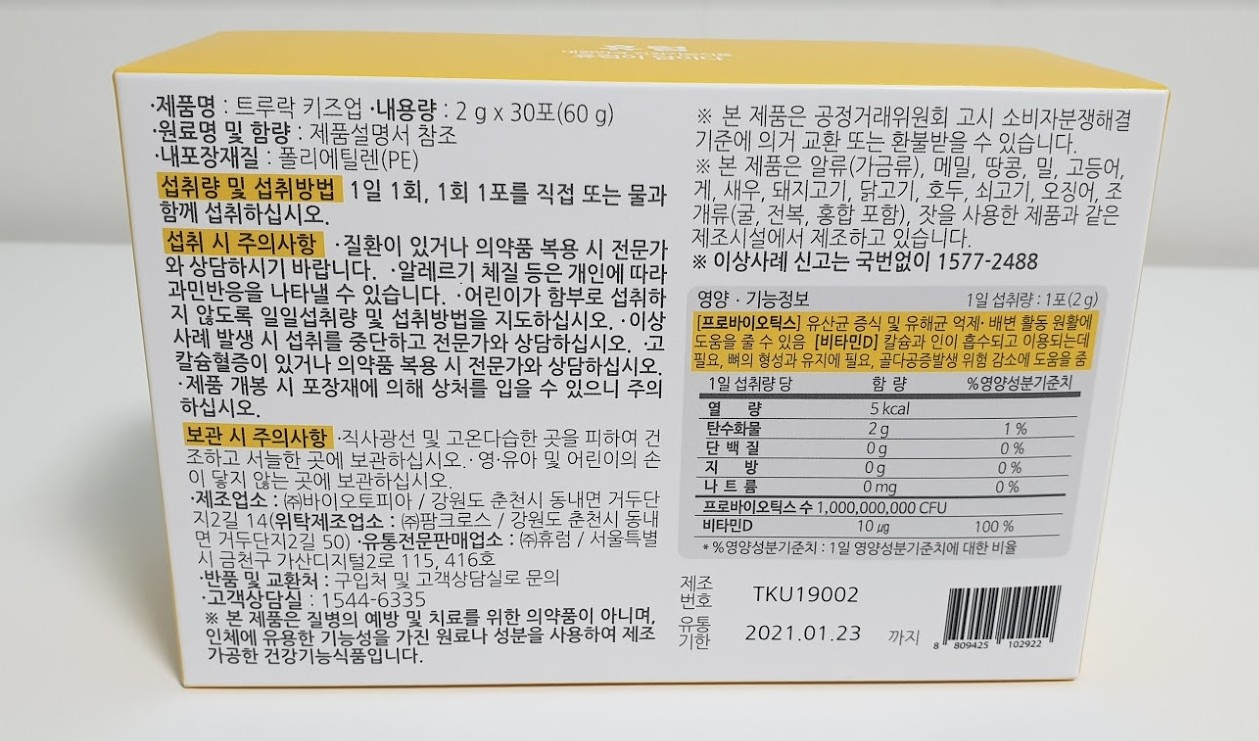 이중에서 트루락 키즈업에서는 7종의 프로바이오틱스와 비타민 D 까지 포함 했다고 합니다. 아이들에게 유익한 프로바이틱스 균주들만 선택을 해서 어린이의 골격 발달과 유지, 칼슘의 장내 흡수를 균형있게 조절하여 뼈 건강까지 케어 해준다고 하네요. 그리고 앞에서도 얘기 했었지만 프로바이오틱스를 위한 먹이힌 프리바이오틱스까지 들어 있다고 하니, 아이들에게는 이보다 좋을수는 없겠죠?