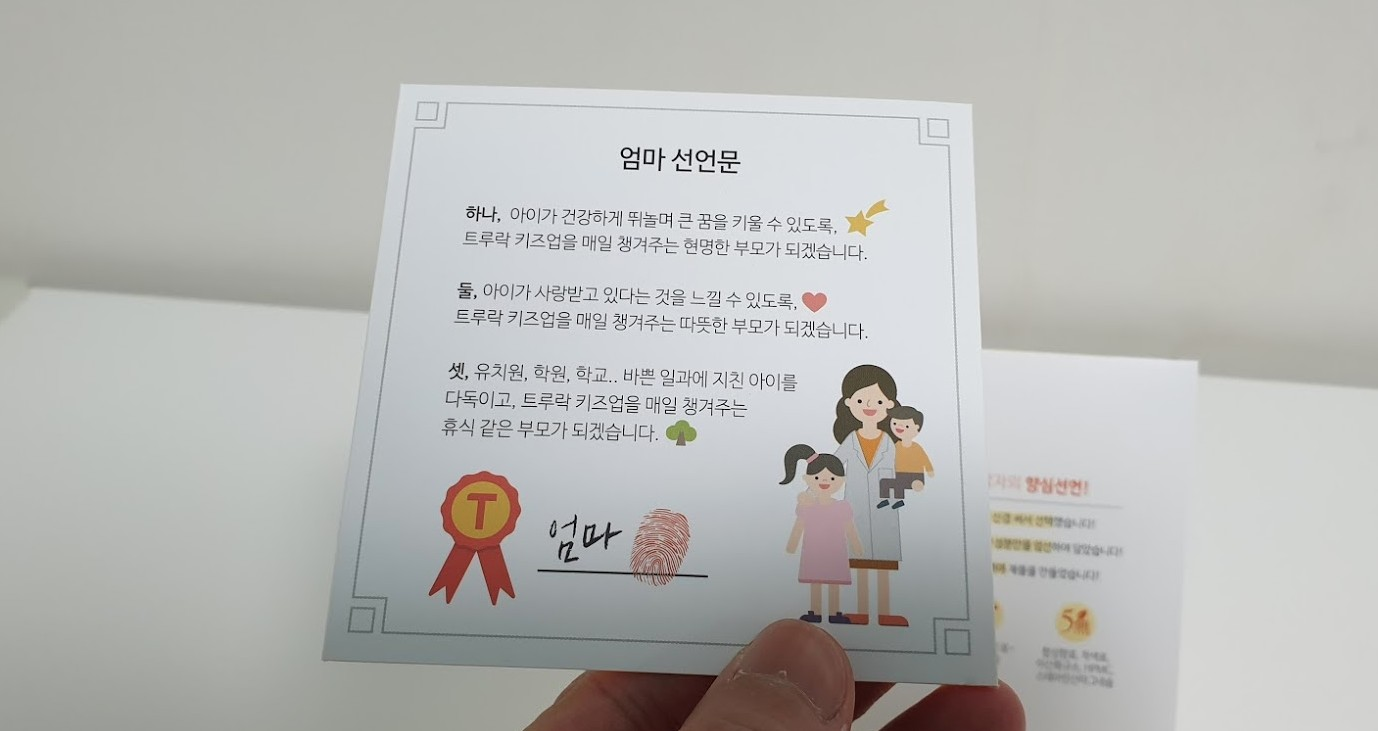 그리고 트루락 키즈업 개봉해 보시면 위와 같이 엄마 선언문 이라는 작은 선언문 하나 들어 있는데요. 좋은 내용이죠? 하지만 제일 어려운거 내용이기도 하죠. 현명하고 따뜻한 휴식같은 부모.. ^^