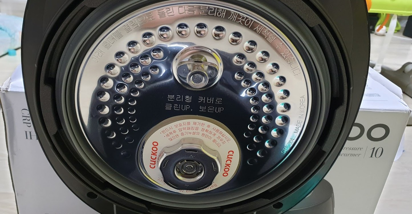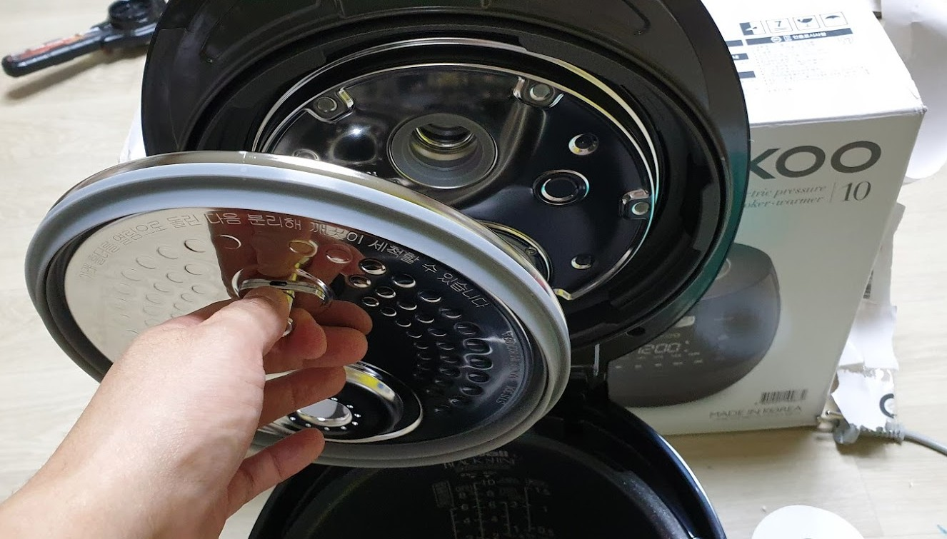 뚜껑을 분리 한후에 위쪽 부분도 가능한 닦아 주는게 좋은거 같더라구요. 아무래도 세 재품이다보니 닦아 주는게 좋겠죠? 아래 사진은 뚜껑을 분리한 모습인데요. 홀더만 돌려 주시면 쉽게 탈착이 가능합니다. 홀더는 약간 힘을 줘서 돌려야지 되더라구요. 원래 쿠쿠가 그런지는 모르겠지만요..