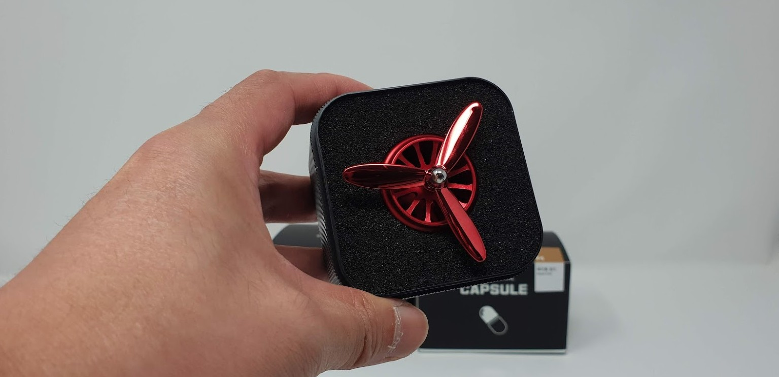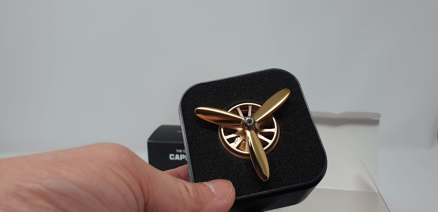 박스를 열면 아래처럼 프로펠러 방향제 본체가 들어 있습니다. 3개의 날개와 정말 엔진처럼 보이는 외형의 제품을 볼수가 있습니다. 지금까지 차량에 달아 놓았던 어떤 방향제 보다도 디자인을 최고 인거 같다는 생각이 드네요. 색상은 골드와 레드를 사용해 봤는데요. 골드도 이쁘지만 역시 레드 색상이 최고네요.