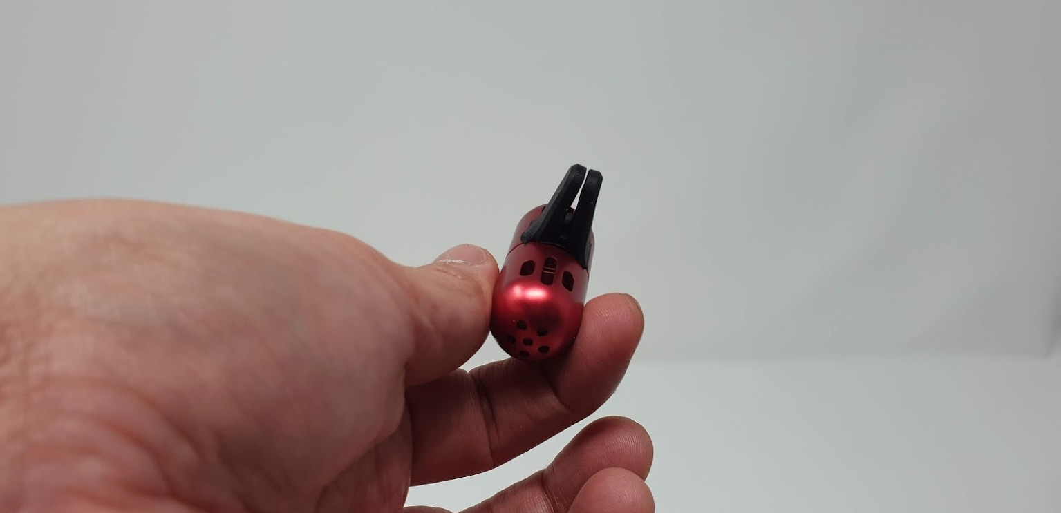 캡슐형대 제품도 마찬가지로 돌려서 열고 안쪽에 방향제를 넣는 방식으로 되어 있습니다. 뒤쪽에는 차량 송풍구에 설치 할수 있도록 클립이 있구요.
