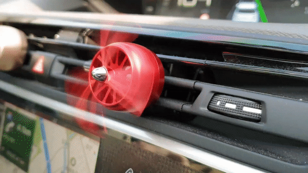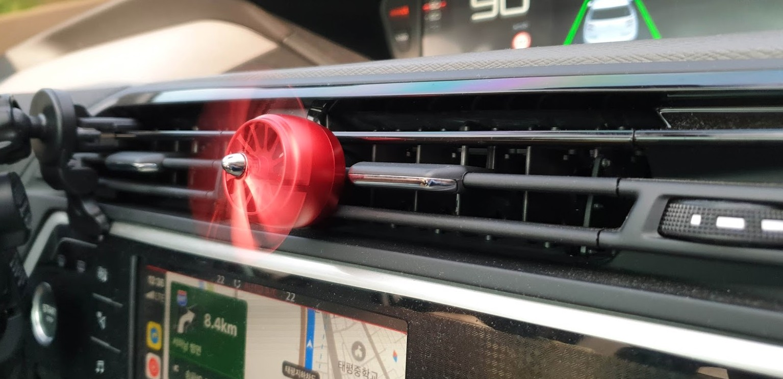 차량에 설치 할때는 클립이 넓은 쪽으로 송풍구에 살짝 꽂아 주시면 됩니다. 왠만한 차량의 송풍구에는 설치하는데 전혀 어려움이 없을거 같더라구요. 클립이 잘 안 벌어지거나 힘을 줘서 꽂을 필요 없이 적당한 힘만 주면 쏘~옥 송풍구에 딱 들어 갑니다. 송풍구에 꽂자마자 바람이 나오고 있다면 프로펠러가 돌기 시작 합니다.