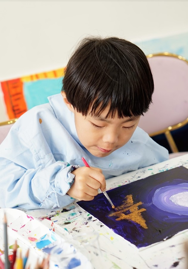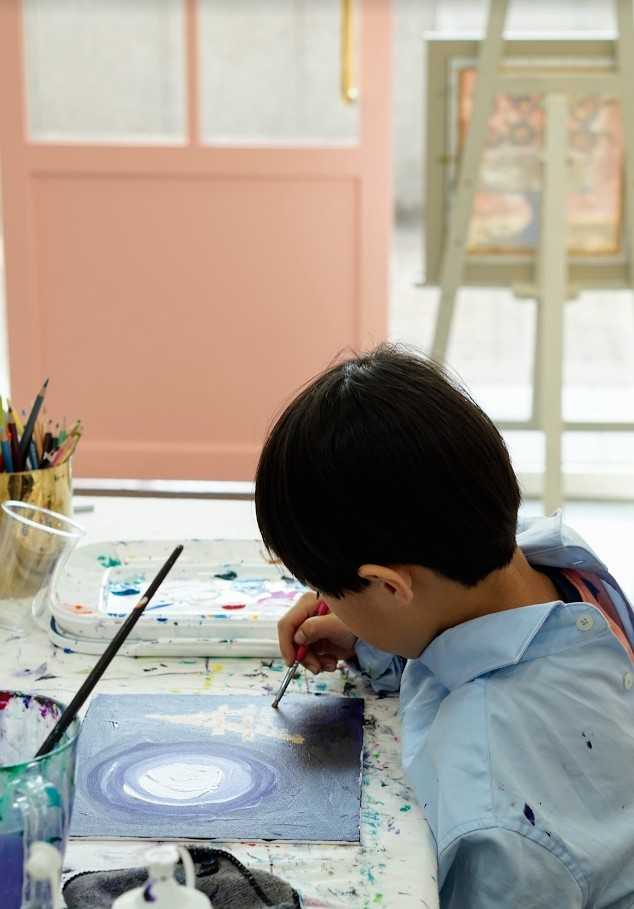 마지막으로 반짝반짝 거리는 ... 점찍기 중이네요.. ㅎㅎ 이런것도 유화, 아크릴 만의 재미인거 같아요. 그림위에 그림을 그리는 느낌은 지금까지 아이가 해본적이 없었던 미술였던거 같습니다. ^^