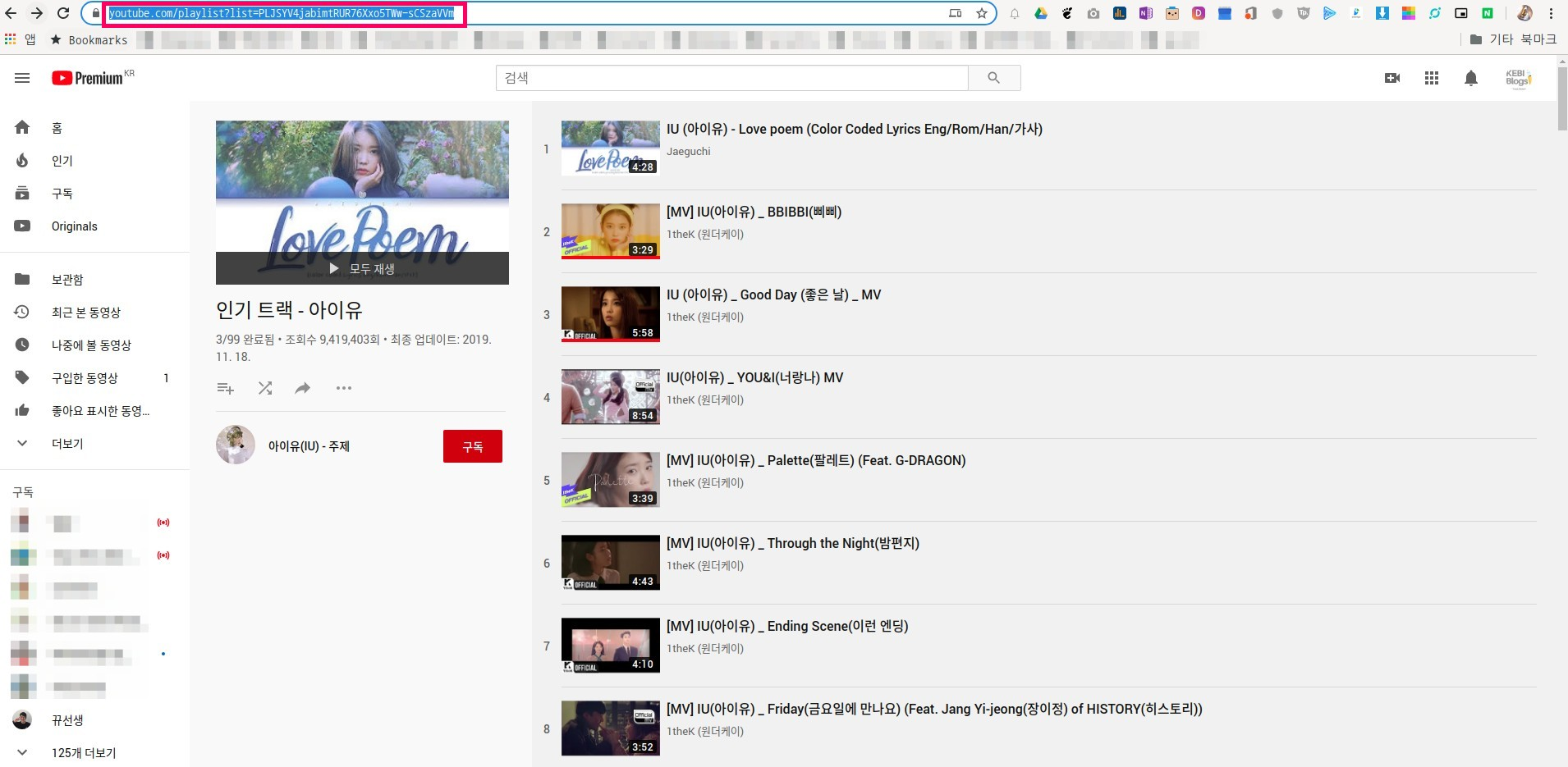 일단 준비가 다 되었으면 유튜브에서 직접 만든 플레이리스트나 혹은 누군가 만들어 놓은 플레이리스트를 봅니다. 그리고 해당 플레이리스트의 주소를 복사해 놓으세요. 플레이리스트 주소는 https://www.youtube.com/playlist? xxxxxxx 이런식으로 되어 있습니다.