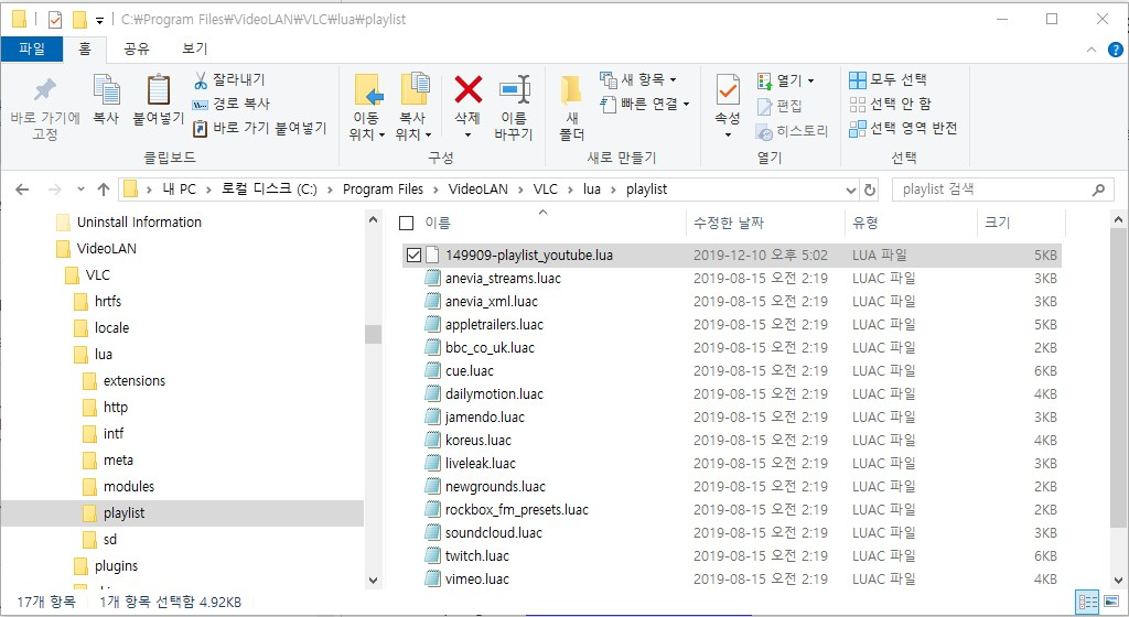 정상적으로 추가를 하셨다면 파일을 저장을 하신후에 아래의 경로로 파일을 옮겨 줍니다. 경로는 OS 마다 약간씩 다를수 있는데 앞에 Addon 웹페이지에 경로가 자세히 나와 있으니 참고 하시면 될거 같습니다. 저 같은 경우에는 아래처럼 " C:\Program Files\VideoLAN\VLC\lua\playlist " 에 파일을 옮겨 놓았습니다.