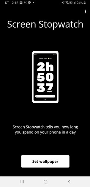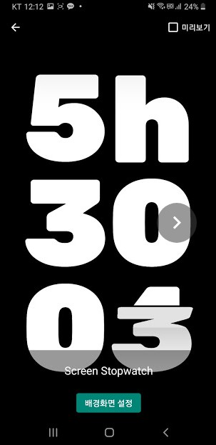 두번째 앱도 앞에서 소개했던 앱과 비슷한 기능을 가지고 있습니다. 스마트폰을 사용하는 시간을 배경화면에서 바로 확인을 할수가 있는데요. 앱 이름처럼 스탑워치 처럼 배경화면에 스마트폰 화면을 키고 있는 상태에서 시간을 카운트 해줍니다. 조금더 직관적으로 내가 얼마나 스마트폰을 사용하는지 확인할수 있는 앱일거 같네요. 마찬가지로 매우 단순한 형태로 검은색 배경에 햐얀색 글자로 시간을 카운트 해줍니다.