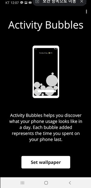 설치 하신후에 실행을 하시면 배경화면으로 설정 할수 있는 화면이 나옵니다. " Set wallpaper" 로 설정을 하면 바로 사용이 가능합니다. 설치하면 바로 하나의 버블이 쌓이는걸 볼수가 있어요 ^^