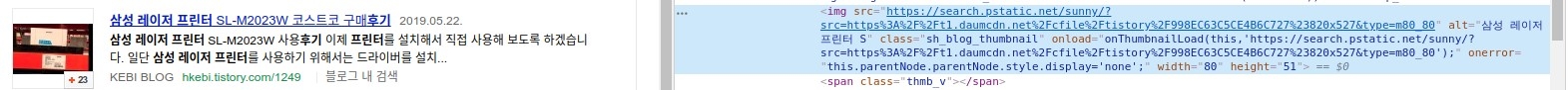 그렇다면 썸네일은 네이버에서 가지고 있는걸까요? 실제로 그런건 아니고 각 블로그의 이미지의주소를 가지고 가져오는듯한 느낌입니다. 아래 보면 이미지는 실제로 search.pstatic.net 네이버 서비스에서 해당 썸네일 이미지 경로에서 이미지를 가져와서 보여주는거 같네요.