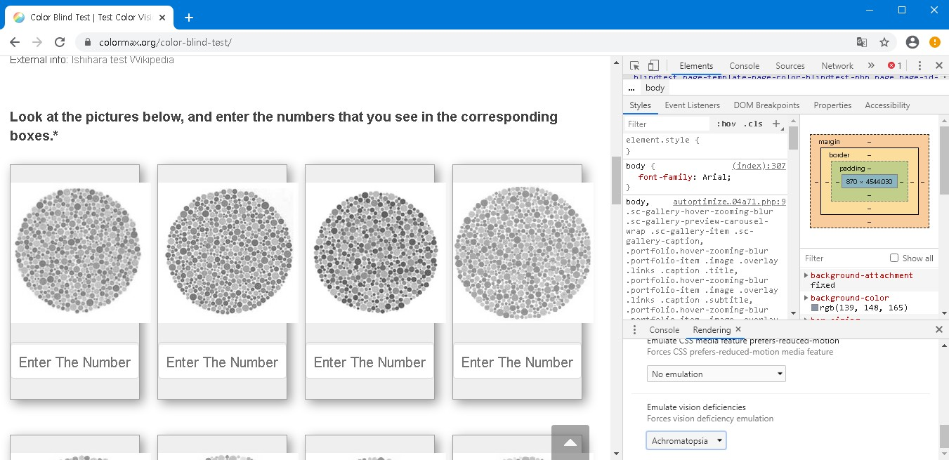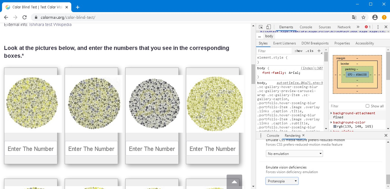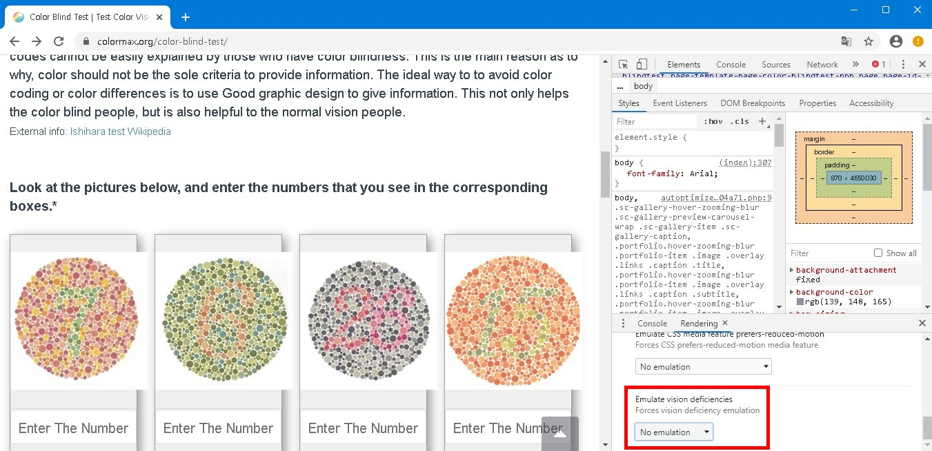 기본은 "No emulation" 으로 되어 있는데요. 클릭을 해보시면 아래와 같이 여러 색약/색맹 타입을 선택을 할수가 있습니다. 저희 아이는 심한 적녹색약이라서 어떻게 보일지 클릭을 해보았는데요. 확실히 색약 테스트에 보이는 이미지에서 숫자가 하나도 않 보이네요 ㅠ ㅠ 다소 비싸기는 하지만 2020/02/01 - [제품 사용기 및 리뷰/생활용품] - 크로마젠 색약 안경 사용 후기 에서처럼 색약 안경을 맞춰주길 잘한거 같네요. 조금 답답할거 같다는 느낌이 많이 들었습니다.
