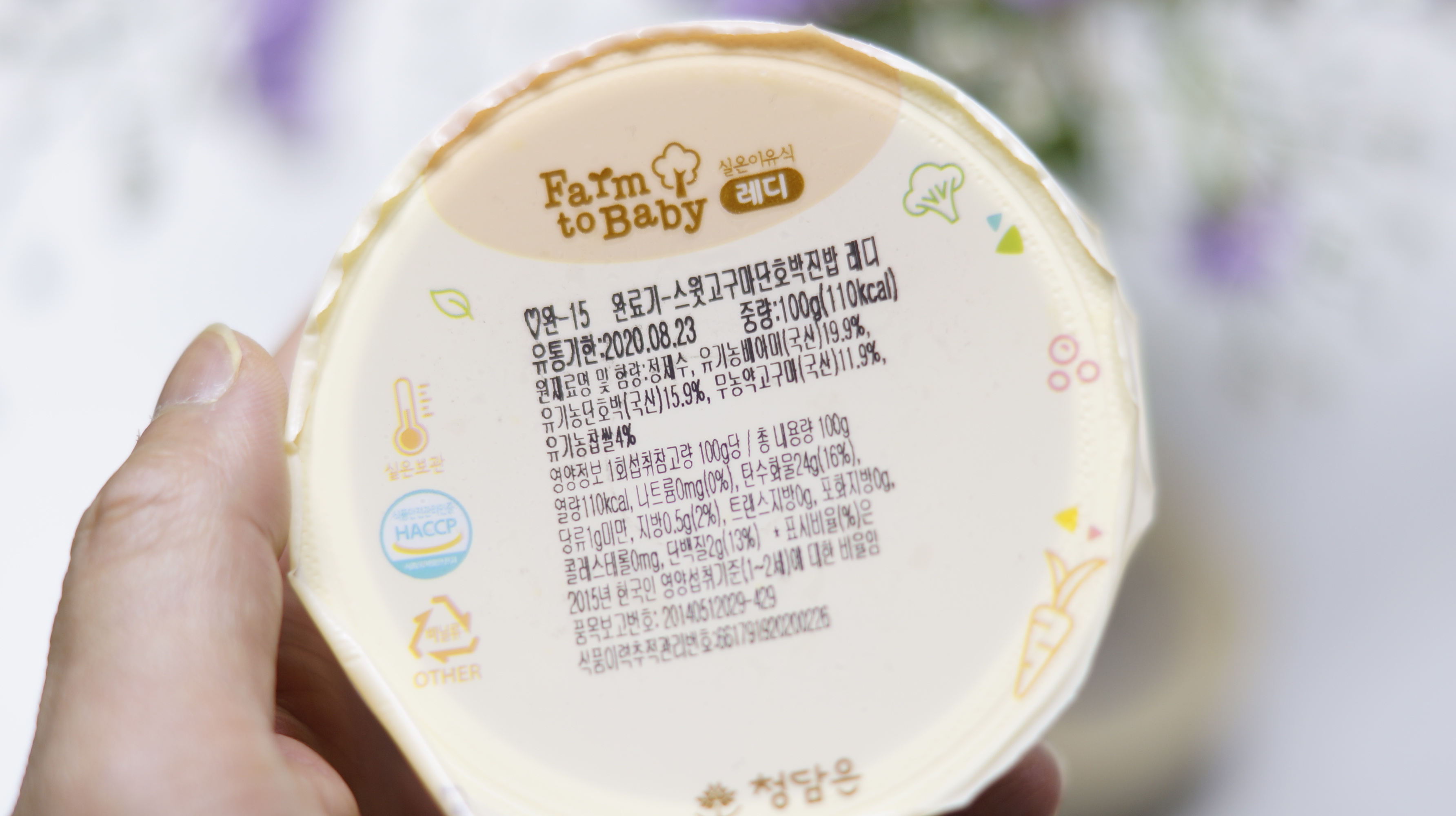 아래 이미지를 보시면 아시겠지만 유통기한이 꾀 깁니다. 실온보관이 가능하고 유통기한도 길어서 외출용으로 괜찮은거 같더라구요. 용량은 100g 정도 인데 저희 아이는 한끼로 적당한 용량이였습니다.