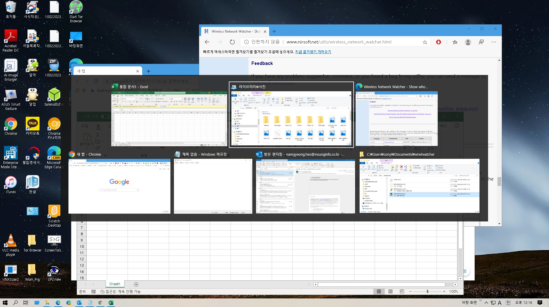 위 캡쳐 화면은 아마도 많이 보셨을 화면 일텐데요. 보통 흔히 사용하는 화면 전화 단축키인 Alt + Tab 을 눌렀을때의 화면입니다. 아주 기본적인 윈도우창 이동 단축키들이죠.