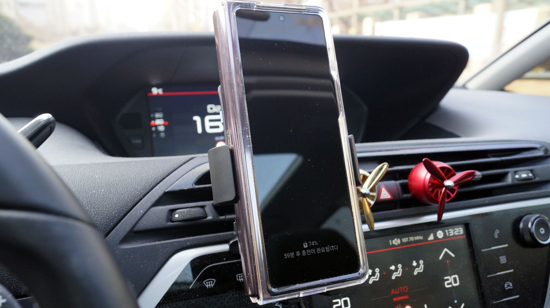 충전은 고속 무선충전으로 됩니다. 물론 Quick Charge 가 지원이 되는 충전기를 사용을 해야 합니다. 아래 사진에서 보시면 고속 무선충전이 되고 있는걸 볼수가 있습니다. ^^ 차타고 조금 이동해도 꾀 많이 충전이 되네요.. ㅎㅎ