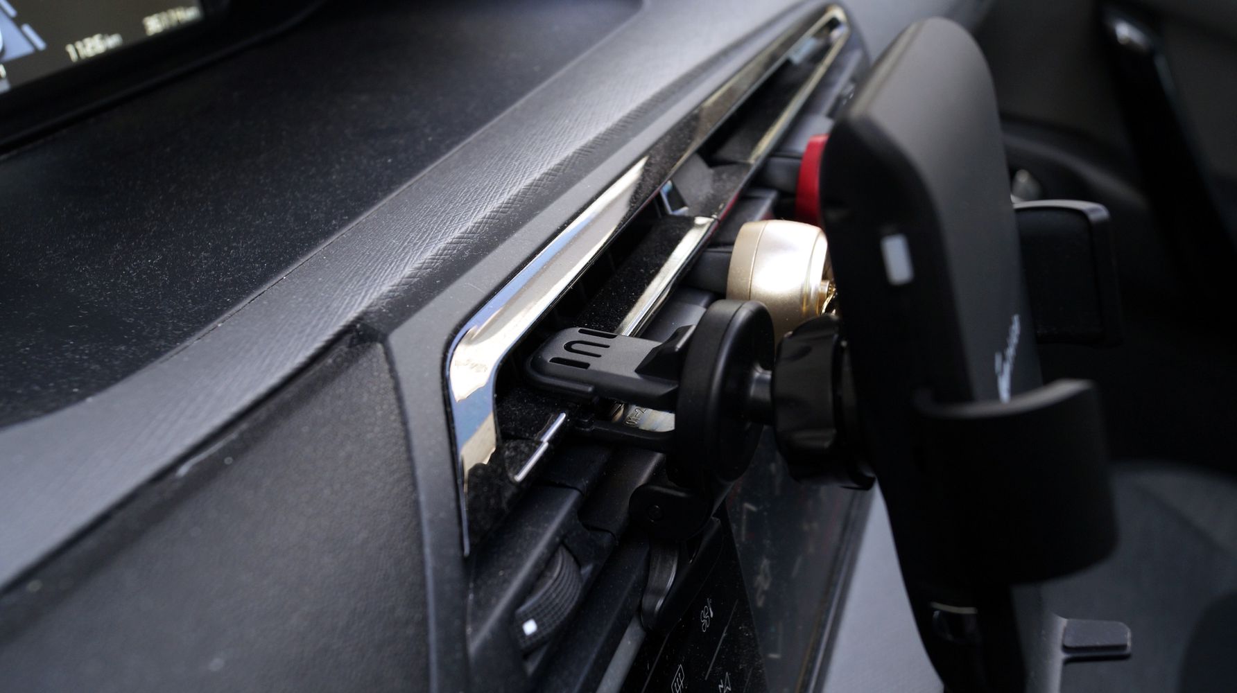 차량 송풍구에 아래처럼 손으로 벌린후에 거치대를 끼워 넣어 주면 됩니다. 거치대를 설치하는건 그리 어렵지 않습니다. 대쉬보드 형을 사용하신다면 역시 적당한 위치를 찾아서 고정을 해주시면 될거 같아요. 저는 송풍구가 편해서 송풍구에 연결을 했습니다. 아래 오른쪽 사진이 연결을 완료한 모습입니다.