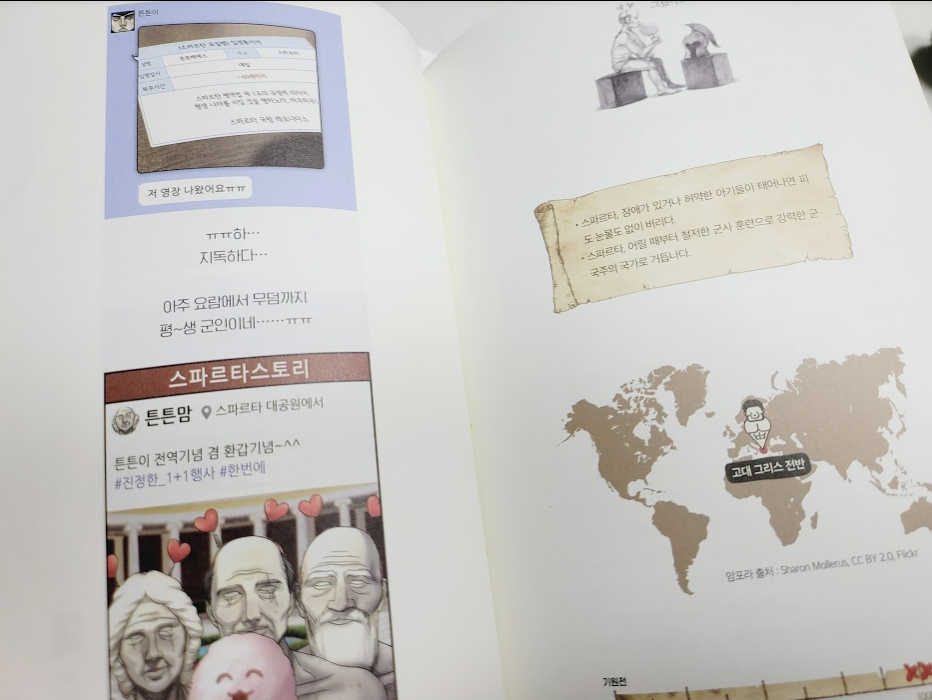 그리고 예전에 300 이라는 영화가 기억이 나는 스파르타 얘기도 나오는데 웃기더라구요. 초등학교 시간표가 무술훈련이 전부네요. 그리고 초등학교 졸업을 하자마나 영장이 나옵니다. 무려 복무 기간이 60세 까지.. ㅋㅋㅋ 전역을 했더니 환갑 ^^ 가족간의 재미 있는 카톡으로 구성을 했는데 저는 제일 웃겼던거 같네요.