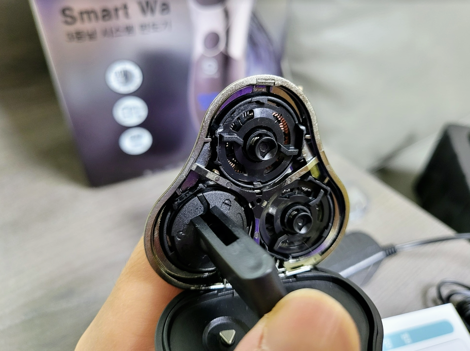 개인적으로 지금까지 전기 면도기를 사용을 하지 않아서 다른 제품들하고 비교를 해볼수는 없지만 (아마도 대부분 비슷하지 않을까 싶기도..) 사용을 한후에 간단하게 분해해서 세척이 가능한 구조로 되어 있습니다. 스마트와 전기면도기는 생활방수 기능이 되어 있어서 물로 세척도 가능합니다.