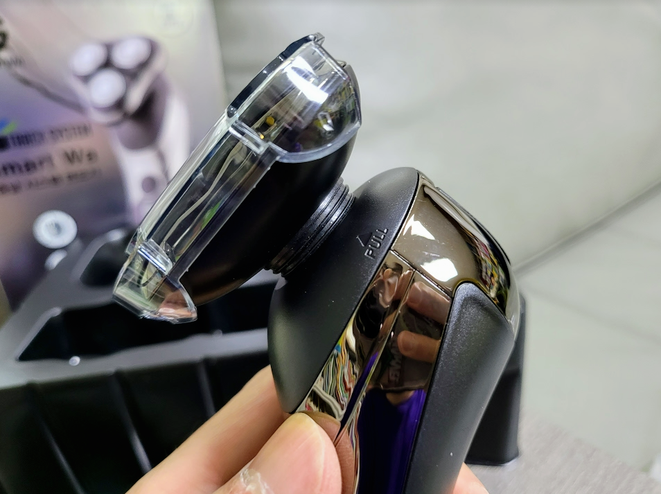 분해 하는 방법도 매우 쉽고 간단합니다. 면도날 부분에 버튼이 있는데 누르시면 아래처럼 면도날 부분이 위로 열리게 됩니다. 면도후에 여기를 청소해 주시면 되는거죠. 청소용 솔도 별도로 제공이 되니 필요하시다면 솔을 이용해서 청소를 해주면 될거 같습니다.