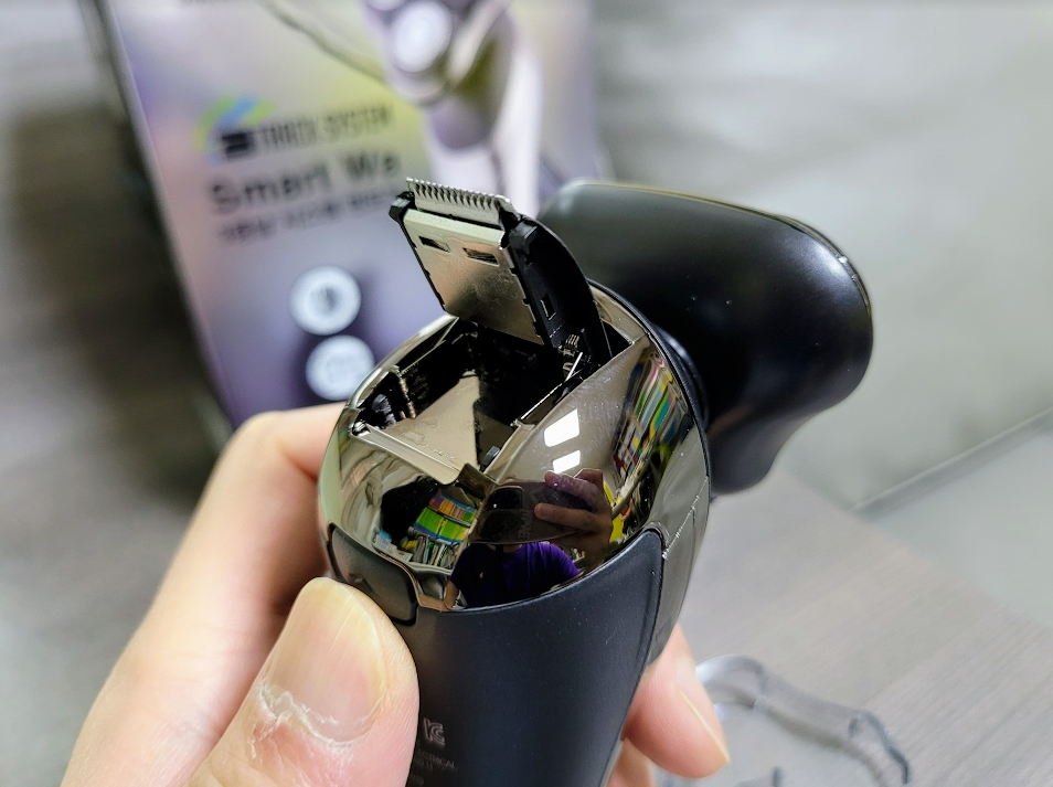 뒤쪽에는 구레나룻 정리를 할때 사용하면 괜찮은 트리머가 장착이 되어 있습니다. 트리머는 뒤쪽에 있는 스위치를 누르면 틱~ 하고 튀어 나와서 바로 사용할수 있습니다. 트리머를 넣을때에는 손으로 내려서 넣어주시면 됩니다. 트리머를 많이 사용하시는 분들이라면 전기 면도기에서 꼭 필요한 기능이죠.