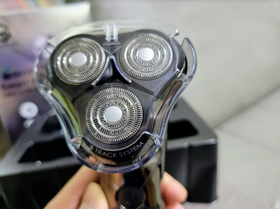 면도날은 3중날로 되어 있습니다. 둥근 모양으로 아래처럼 3개의 날이 되어 있구요. 헤드 부분은 움직일수 있는 구조로 되어 있습니다. 3중날 구조들은 보통 이렇게 생긴거 같더라구요.