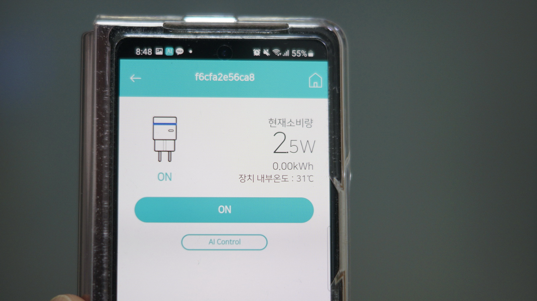 자, 그럼 이제 장치 등록이 완료 되었으니 이제 AI 스마트 플러그를 켜서 컴퓨터를 킬수 있는 상태로 만들어 보도록 할께요. 방법은 그냥 OFF 를 터치해서 ON 으로만 변경을 해주시면 됩니다. 그러면 아래처럼 전원이 켜지고 전력 소비량도 표시가 되기 시작 합니다.