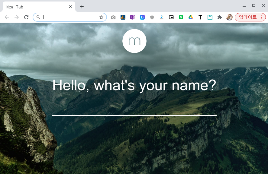 Momentum 은 예전에 많이 사용했던 확장 프로그램인데요. Momentum 같은 경우에는 멋진 이미지와 함께 할일과 시간등을 보여 주게 됩니다. 심플하지만 멋진 확장프로그램입니다. 마찬가지로 가입을 해야지만 사용을 할수가 있는데요. 처음에 확장프로그램 설치후에 새탭을 열게 되면 아래처럼 이름을 입력 하라고 나옵니다.