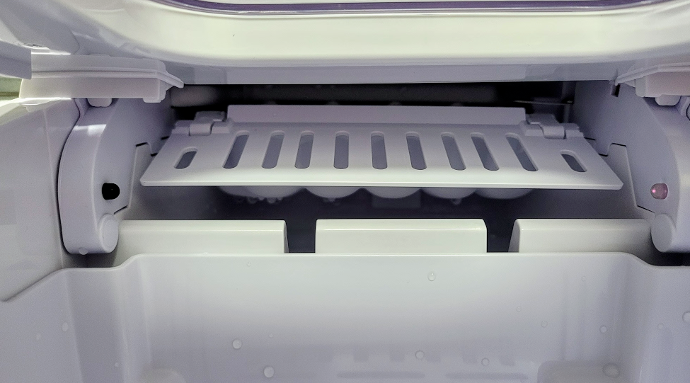 안쪽 상황을 보면 아래처럼 얼음 모양틀이 위쪽으로 올라가고 거기에 물이 받아져서 얼음이 얼리기 시작 하는거 같더라구요. 첫 사용할때에는 얼음이 얼기까지 약간의 시간이 필요 했던거 같습니다.