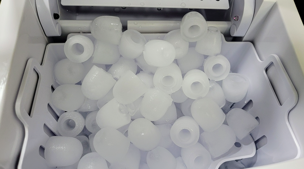 그리고 약간의 시간이 지나자 얼음이 가득 찼습니다. 이정도 얼음을 만들었으면 몇일은 사용할수 있을거 같네요. 딱히 보관 기능이 있는거 아니기 때문에 이렇게 모아 놓은 얼음은 냉동실에 넣어 뒀습니다.