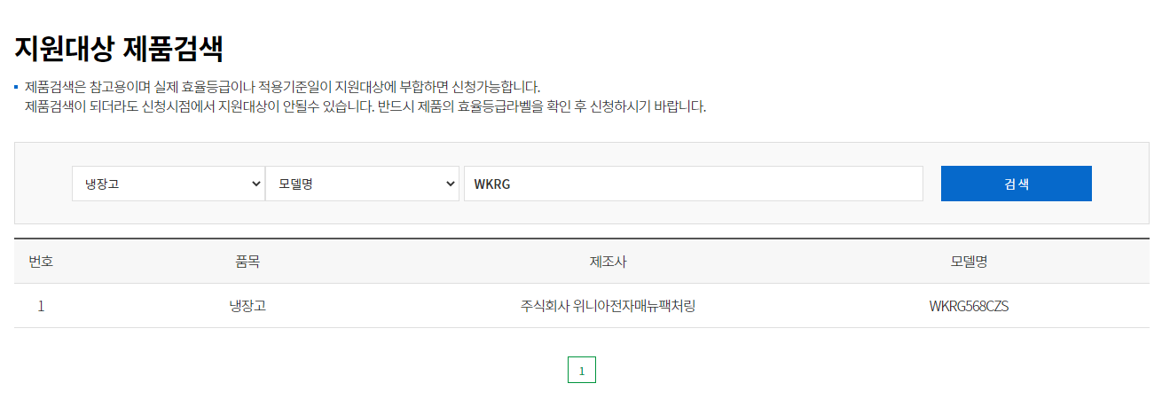 일단 내가 구입한 제품이 지원대상제품인지 확인을 하시는게 좋은데 상단 메뉴중에서 " 지원대상제품검색 " 을 클릭을 하신후에 모델명을 입력해서 검색을 하시면 지원이 되는 제품인지 확인이 가능합니다. 제가 이번에 구입한 제품은 위내아 냉장고 입니다. 요즘 냉장고 너무 비싸더라구요. 찾아보니 위니아에 매우 저렴한 냉장고가 있어서 구입했네요.