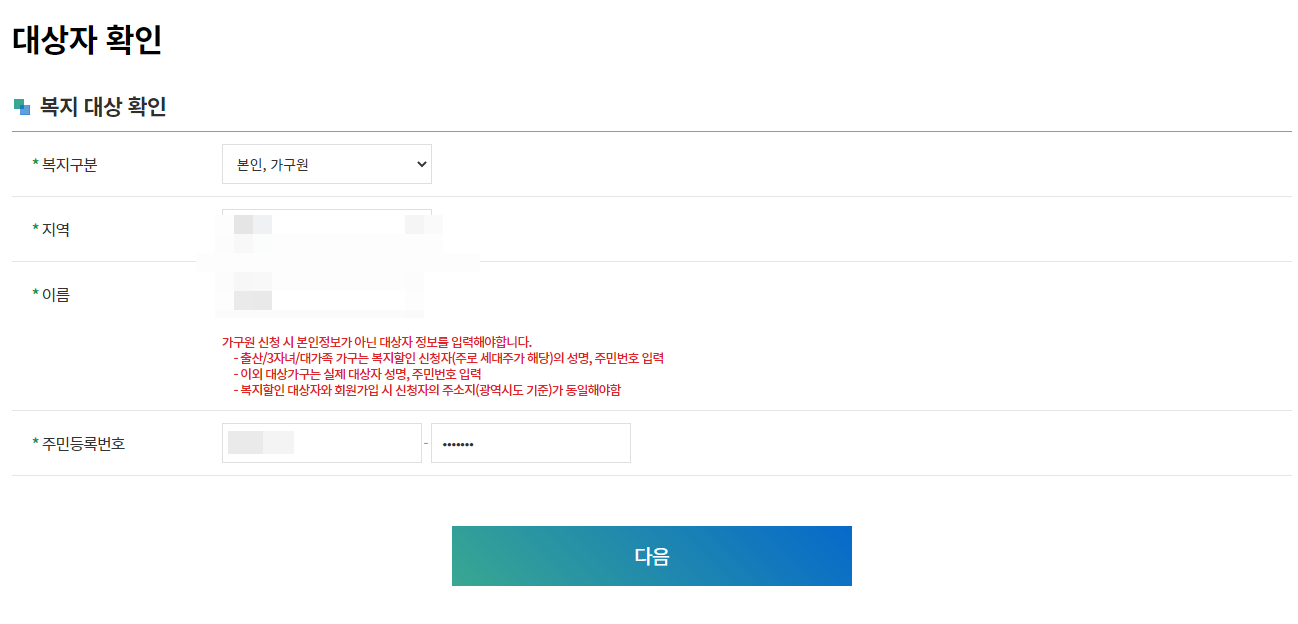 이제 준비가 다 되었으니 사업신청을 해주시면 됩니다. 사업신청 메뉴를 클릭을 하시면 아래처럼 3가지 메뉴증에 하나를 선택을 할수가 있습니다. 대부분은 복지할인대상자 본인 신청을 클릭을 하시면 될거에요. 하단에 있는 신청하기 버튼을 눌러서 신청을 하시면 됩니다.