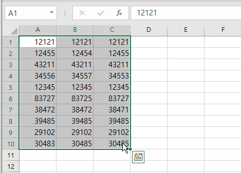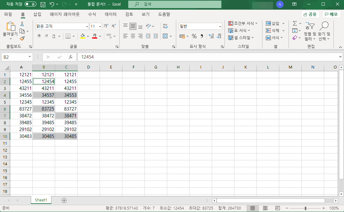 아래와 같은 엑셀에 3개의 열에 비슷한 값들이 있습니다. 그런데 중간중간 다른값들이 섞여 있는데요. 그냥 눈으로 보면 찾기 어려운 값입니다. 그냥 - 를 이용해서 찾을수도 있겠지만 조금더 간단하게 찾을수 있는 방법이 있습니다.