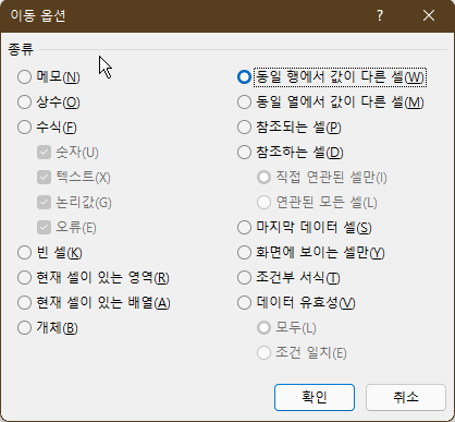 이동 옵션중에서 "동일 행에서 값이 다른 셀" 혹은 "동일 열에서 값이 다른 셀" 을 이용을 하시면 됩니다. 상황에 맞게 행이나, 열을 맞게 사용을 하시면 됩니다. 선택을 하신후에 확인을 눌러 주시면 됩니다.