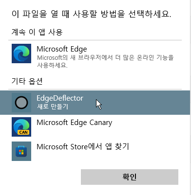 아래 보시는것 처럼 [앱]-[기본앱]-[Microsoft Edge] 에 가신후에 아래쪽으로 내려 보시면 Microsoft-Edge 라고 되어 있는 부분이 있습니다. 이부분을 눌러 주셔서 방금 설치한 EdgeDeflector 로 변경을 해주시면 됩니다.