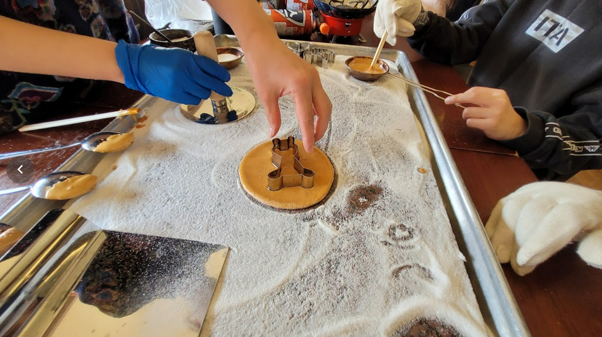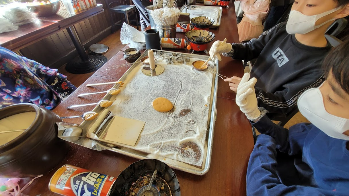 이제 한쪽 테이블로 가서 열심히 뽑기를 해봅니다. 아이들 모두 신중을 기해서 열심히 하네요. 오징어게임에서처럼 혀로 핧아서 얇게 만드는 기술을 시전 하시는 분들은 없네요 ^^ 정통법으로 그냥 이쑤시게를 이용해서 콕콕 찔러서 해봅니다.