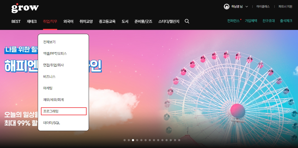 그로우 홈페이지에서 "취업/직무" 카테고리내의 "프로그래밍" 부분에서 찾을수 있는 강의 입니다. 현재 인기순으로 조회 했을때 제일 앞에 있는 강의 입니다.