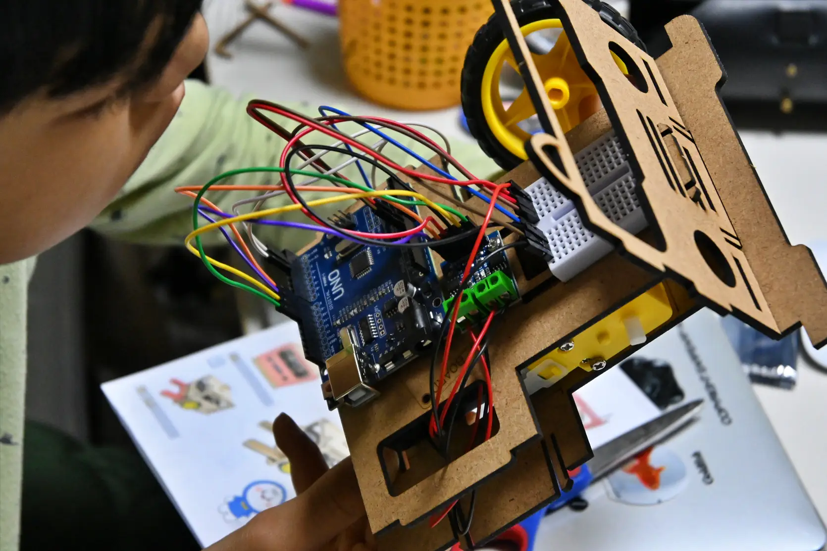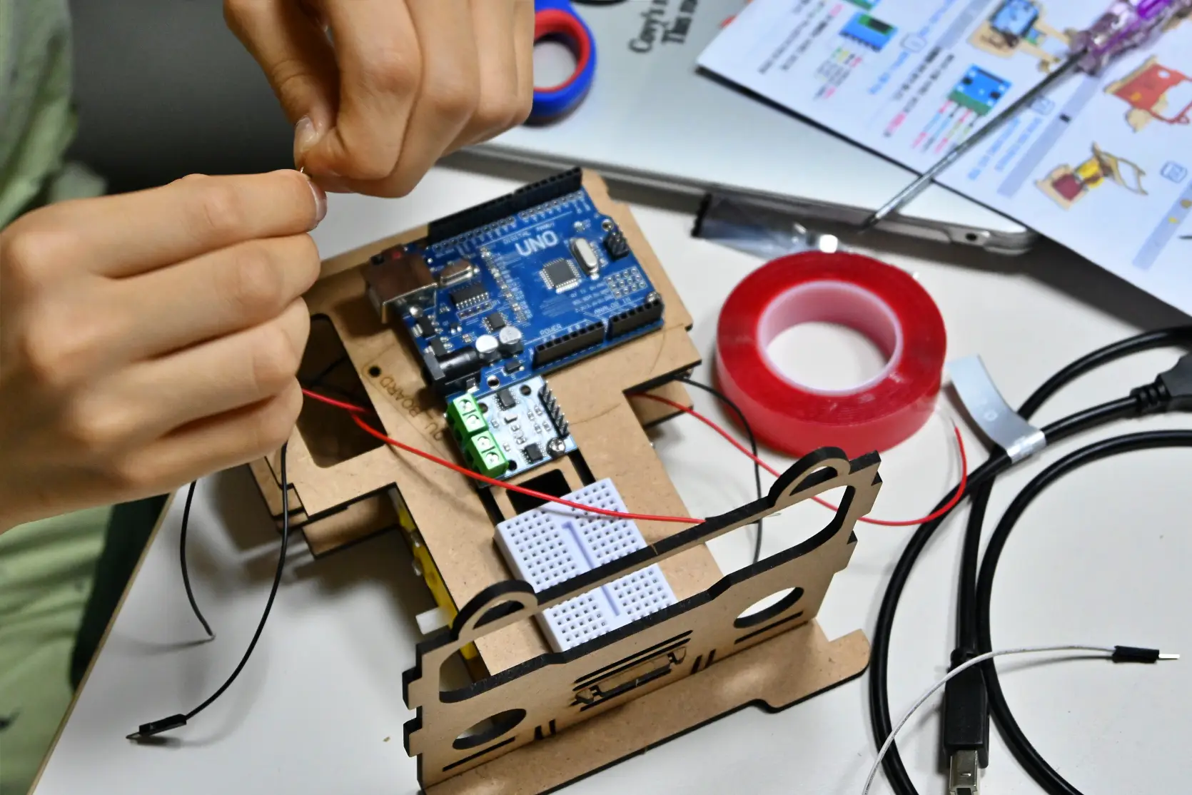 강의 모면서 직접 하나하나 조립을 하고 있습니다. 연구원 같은 느낌이 들지 않나요? 영상을 그대로 보고 따라하면 누구나 쉽게 할수가 있습니다. 어느정도 하다가 보니 모양이 완성이 되어가고 아두이노 보드와 모듈들이 자리를 잡아 가는게 보이네요.