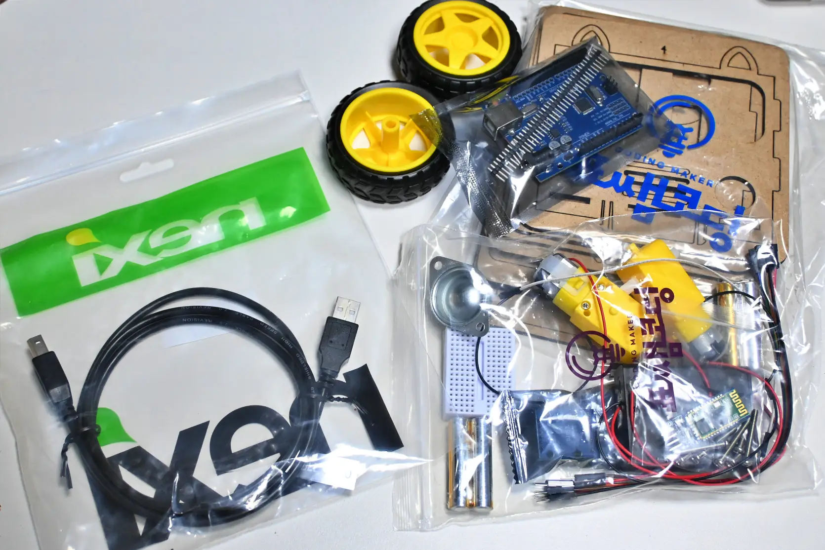 개봉을 해보시면 아래와 같이 아두이노 우노보드와 자동차를 만들수 있는 MDF, 그리고 전선과 모터, 바퀴, 필요한 모듈등이 들어 있는걸 볼수가 있습니다.