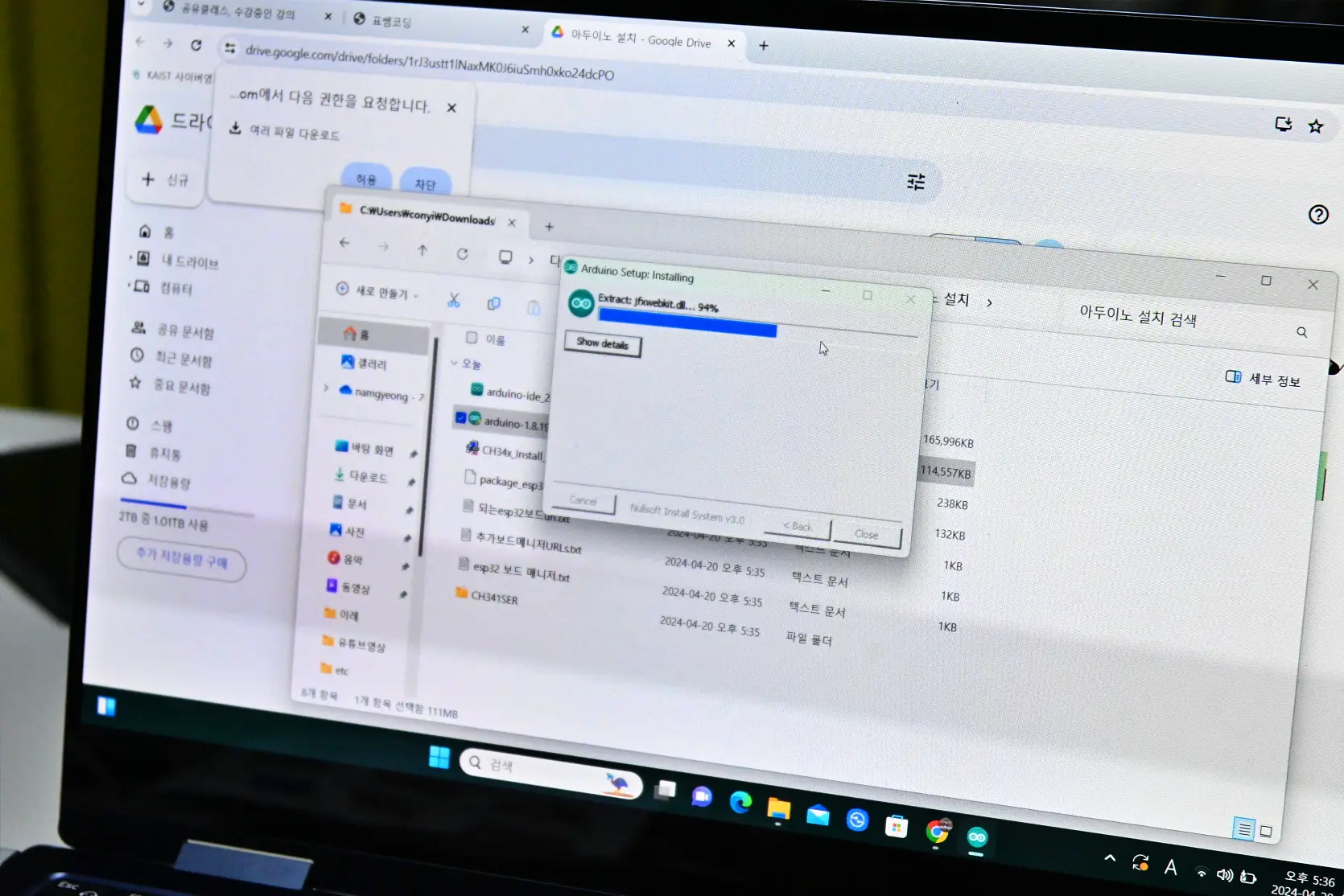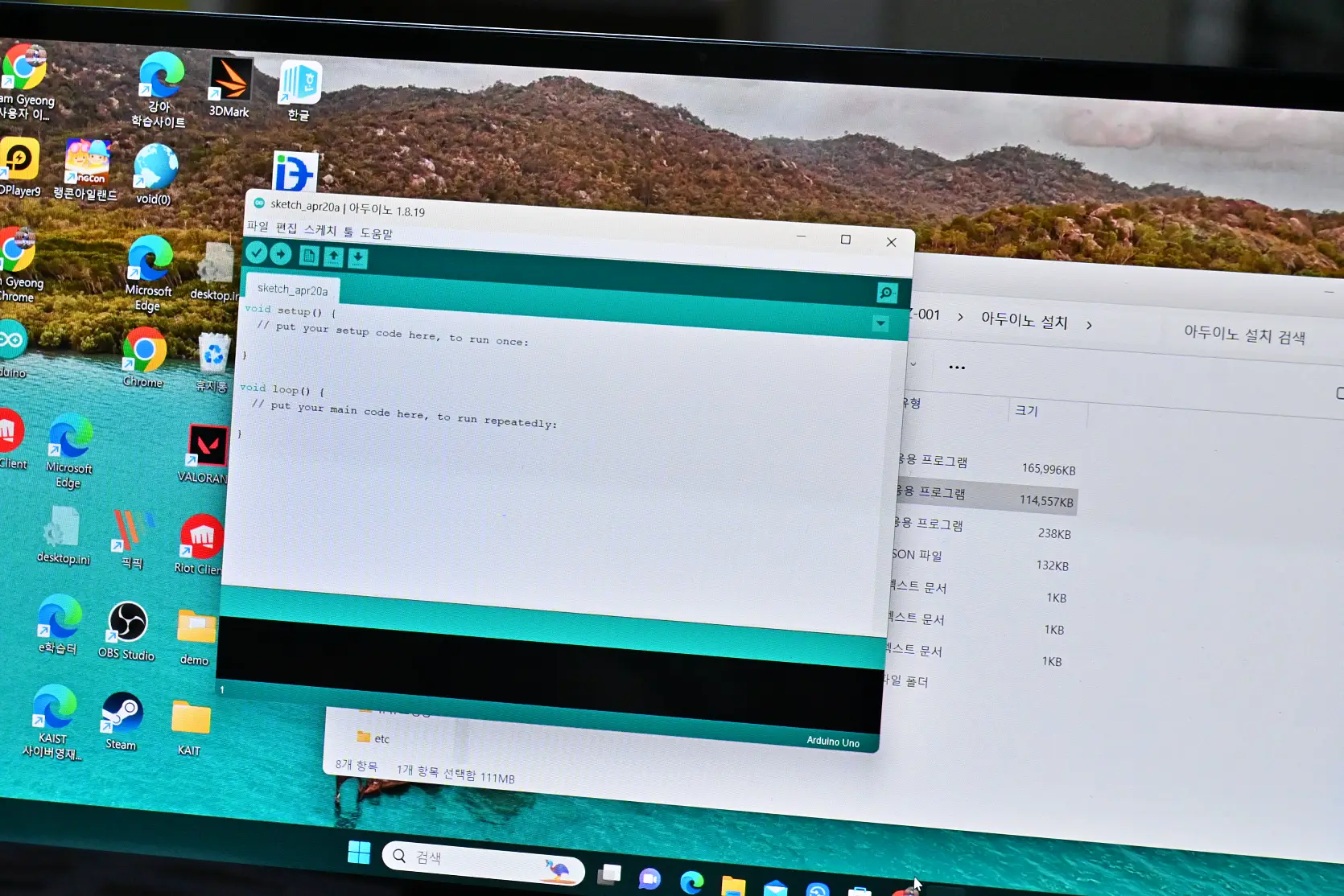 프로그램들도 모두 설치하고 USB 케이블을 이용해서 우노보드와 노트북에 연결까지 스스로 뚝딱 해냅니다.
