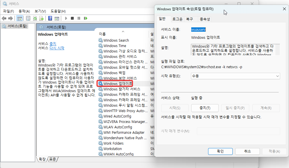 계속해서 문제가 된다면 아래와 같이 아예 윈도우 업데이트 서비스를 비활성화 할수가 있습니다. 하지만 계속해서 업데이트를 하지 않는건 문제가 될수 있기 때문에 나중에는 다시 한번 업데이트를 시도를 해보시는 좋습니다.